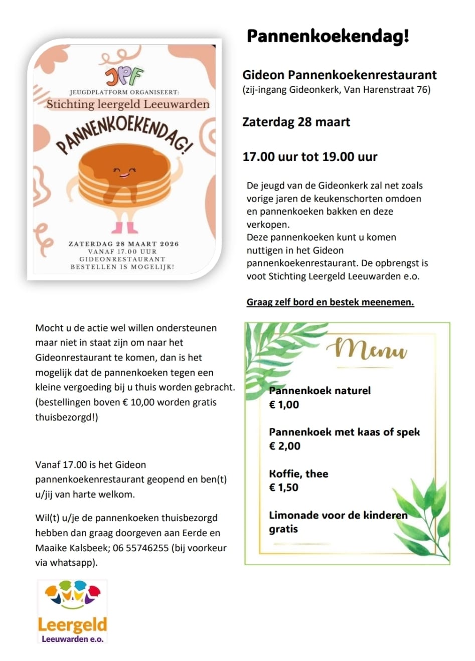 Mocht u de actie wel willen ondersteunen maar niet in staat zijn om naar het Gideonrestaurant te komen, dan is het mogelijk dat de pannenkoeken tegen een kleine vergoeding bij u thuis worden gebracht, (bestellingen boven € 10,00 worden gratis thuisbezorgd!)