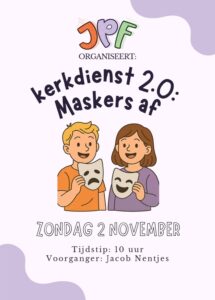 Zondag 2 November 2.0 dienst Maskers af Zondag 2 november organiseert JPF weer een 2.0 dienst. Thema deze keer Maskers af. Voorganger Jacob Nentjes.